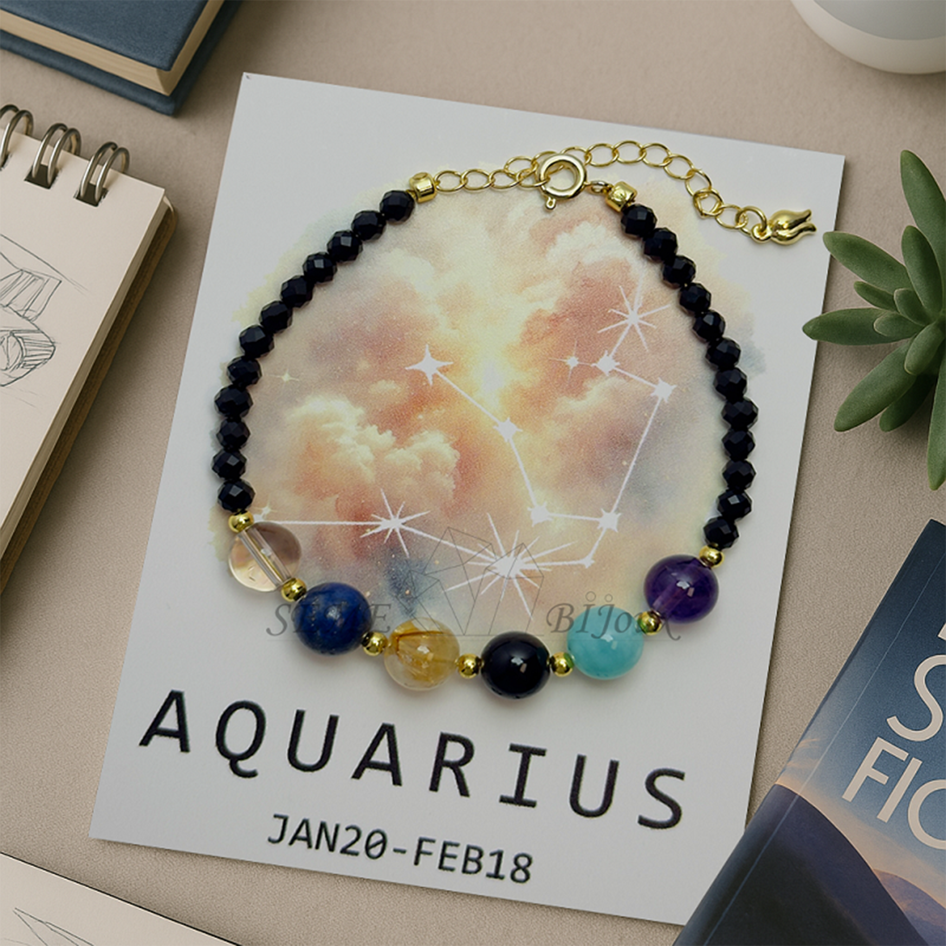 Ce bracelet est dédié aux natifs du Verseau (20 janvier – 18 février), signe d'air visionnaire, créatif et humanitaire. Les pierres choisies soutiennent l'innovation, l’harmonie spirituelle et la quête d'un monde meilleur, fidèle à la nature idéale du Verseau.