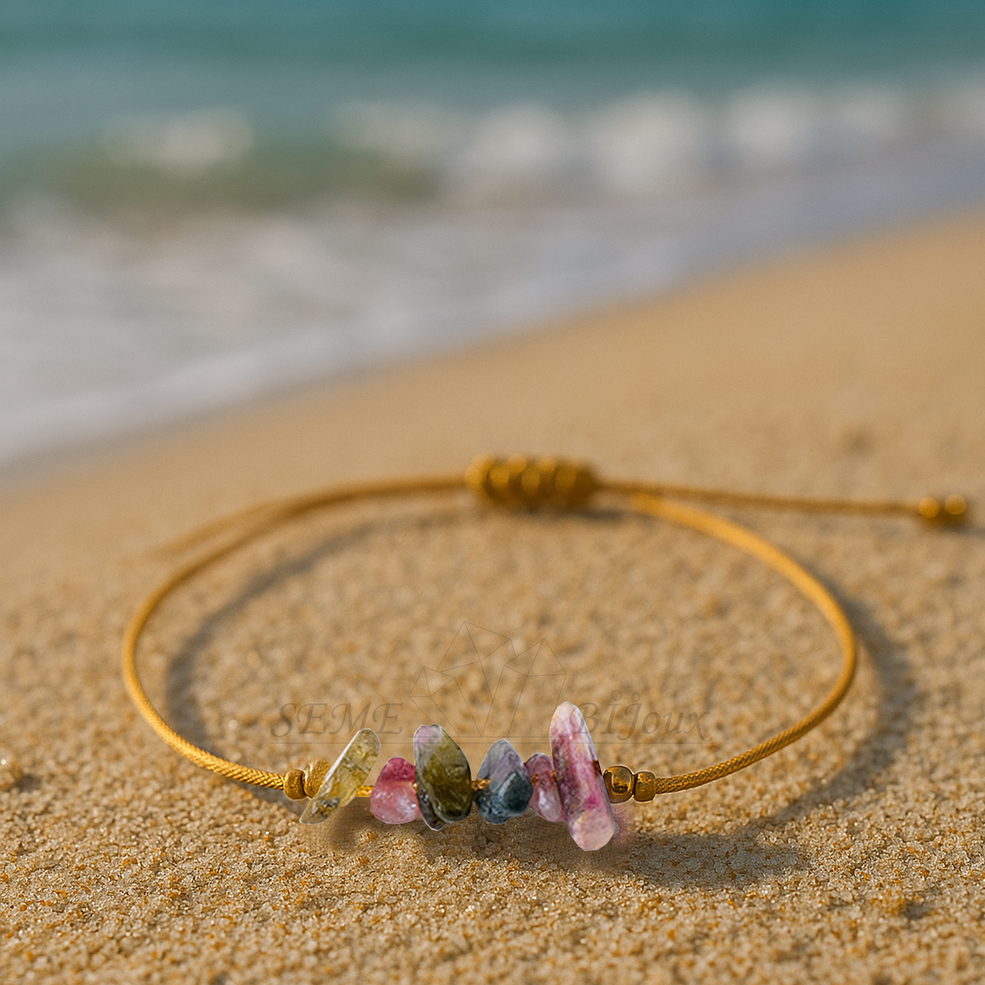 Un jeu de couleurs délicat et spontané. La tourmaline, pierre d’ancrage et de transformation, aide à rééquilibrer les émotions et à renforcer l’aura. Une touche colorée pour les âmes libres.